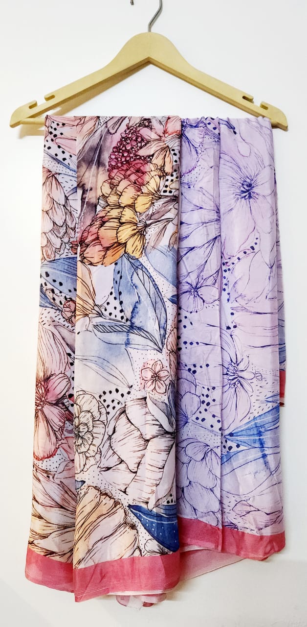 Multi Colored Saree is woven using the finest chinon fabric. This saree promises not only a breathtaking appearance but also a luxurious feel against the skin. Its color serves as the perfect canvas for the hand-painted multi color floral print, each bloom intricately detailed to capture the essence of nature's beauty.
